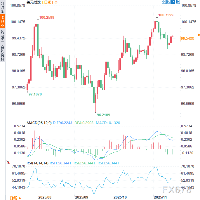 周二(11月18日)美元指数于99.55附近震荡。