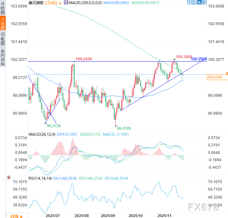 上行方向,位于99.50上方的前上行趋势阻力位将是关键关注位。若能持续突破该趋势线,或将强化看涨倾向,200日均线(99.60)是多头布局的下一阻力位。若美元指数成功突破200日均线,100.25的阻力位将是多头的明确目标——去年11月的涨势正是在此附近遇阻。