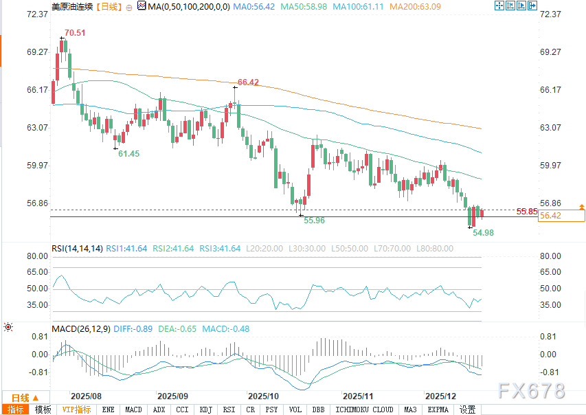 不过,从摆动指标走势来看,原油市场主趋势仍处于下行通道,且50日均线位于59美元附近。市场预计,若油价上行触及该区间,卖盘力量或将再度涌现。若油价失守55.85美元支撑位,则可能再度回落至本周低点54.84美元。
