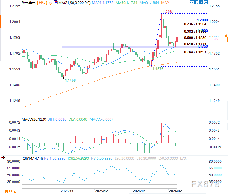 此外,1月低点1.1578至月末高点1.2083的61.8%斐波那契回撤位位于1.1770附近;本轮自1月中旬启动、月末见顶的上涨行情始终守住该关键斐波那契水平,进一步强化技术支撑。
